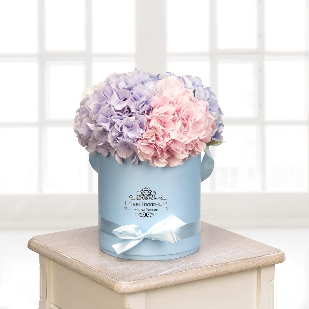 5 гортензий в голубой шляпной коробке от "Империя цветов" - это лучшее оружие в любви. Вы точно сразите наповал получателя подобным подарком, который не нуждается в особом уходе. Пышные цветы могут обходится без полива сутки благодаря специальному резервуару с водой, который флористы предусмотрительно установили на дно футляра.