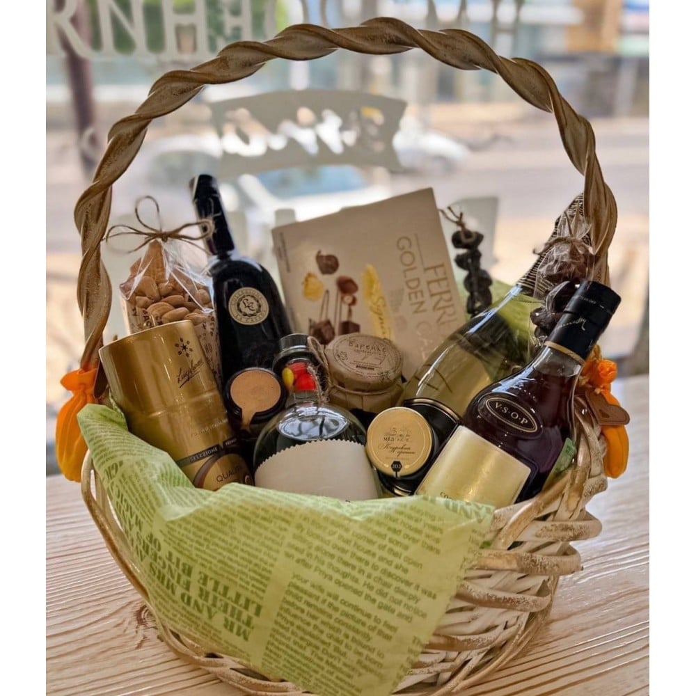 Состав Корзины: 7 красных роз, alcohol, ferrero rocher, chocolate bars