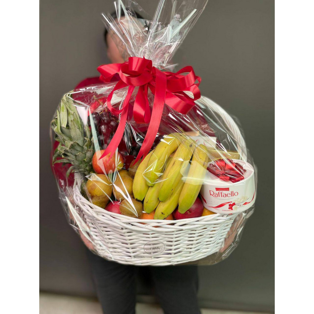 Состав Корзины : виноград, ананас, груши и яблоки в изысканном оформлении. Корзинку можно взять с собой на пикник, а также украсить праздничный стол. Доставка круглосуточная по всему городу… А наш ценовой ряд  позволит вам наслаждаться встречей  без лишних сомнений.