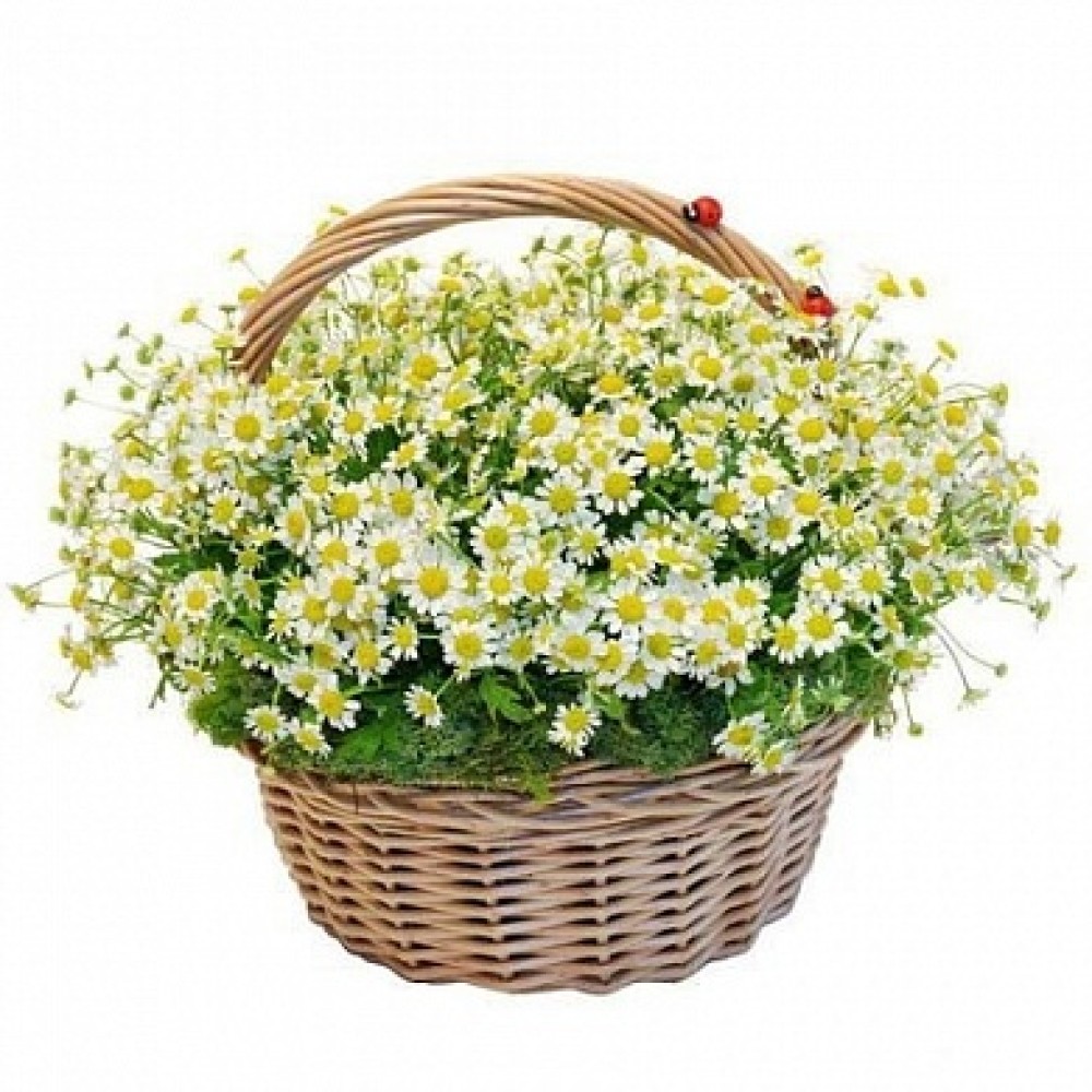 "Летний вальс – это когда белоснежные облачка танцуют по высокому безоблачному синему небу. Или когда солнце плавно проходит сквозь «прорехи» в зеленых листьях, или когда под синим высоким небом по зеленой траве разбегаются солнечные ромашки!" - это несомненно про великолепие большой корзины из полевых ромашек. Шикарное исполнение букета, который оценит каждый.
